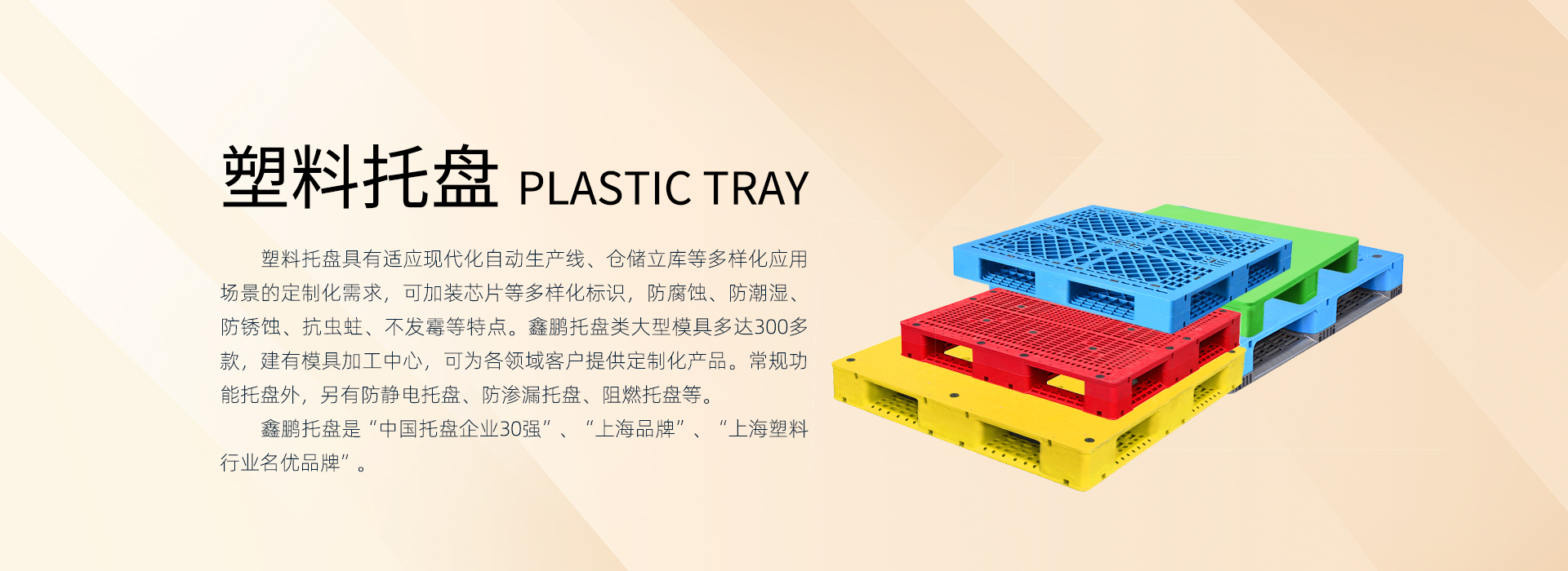 上海鑫鵬塑料創始于1987年,始終專注深根塑料產業鏈,業務板塊包括:塑料原料貿易、塑料制品研發制造(塑料托盤、塑料箱筐、卡板箱、環衛桶等)?,F全國有5個生產基地:上海2個、四川1個、江蘇2個。